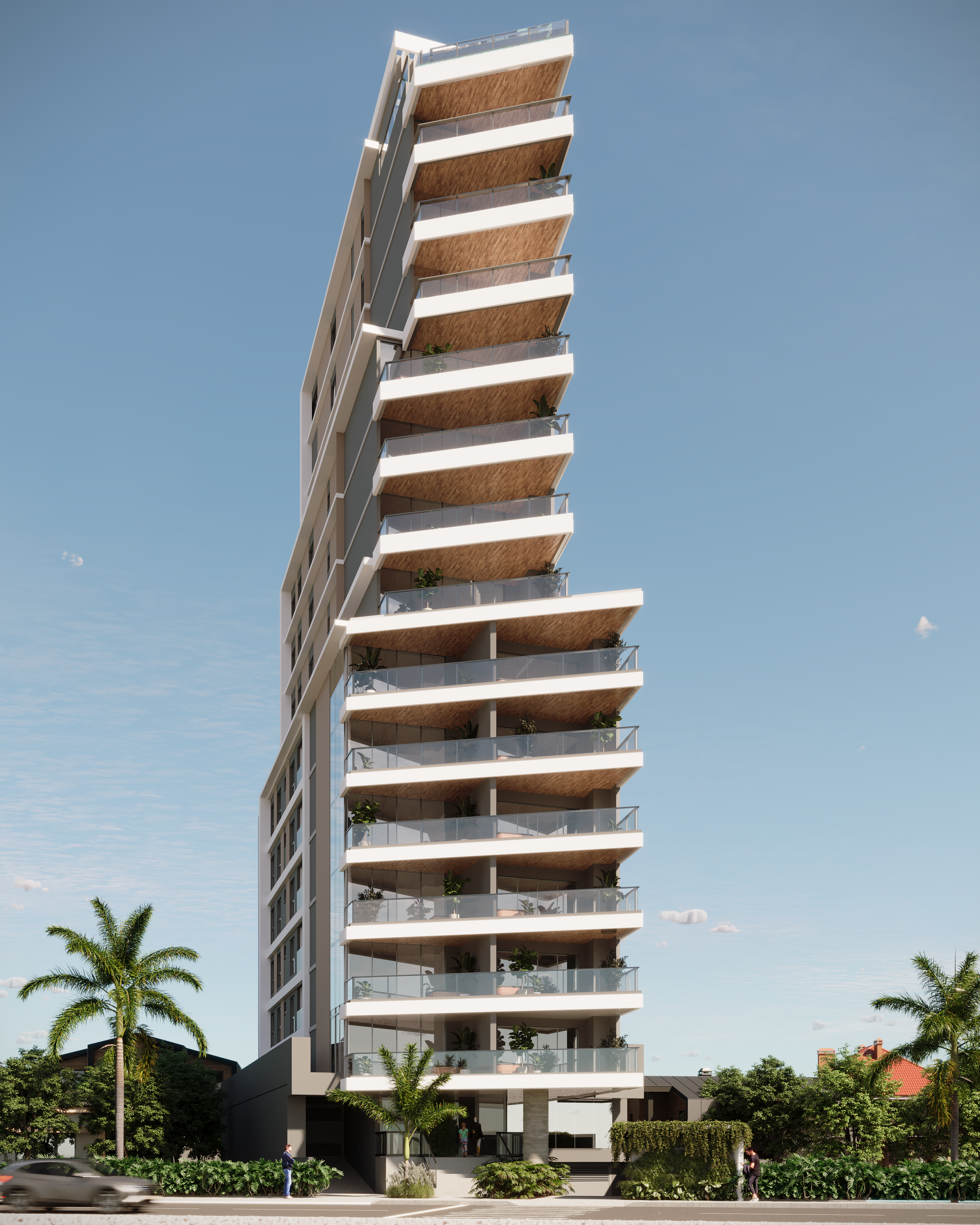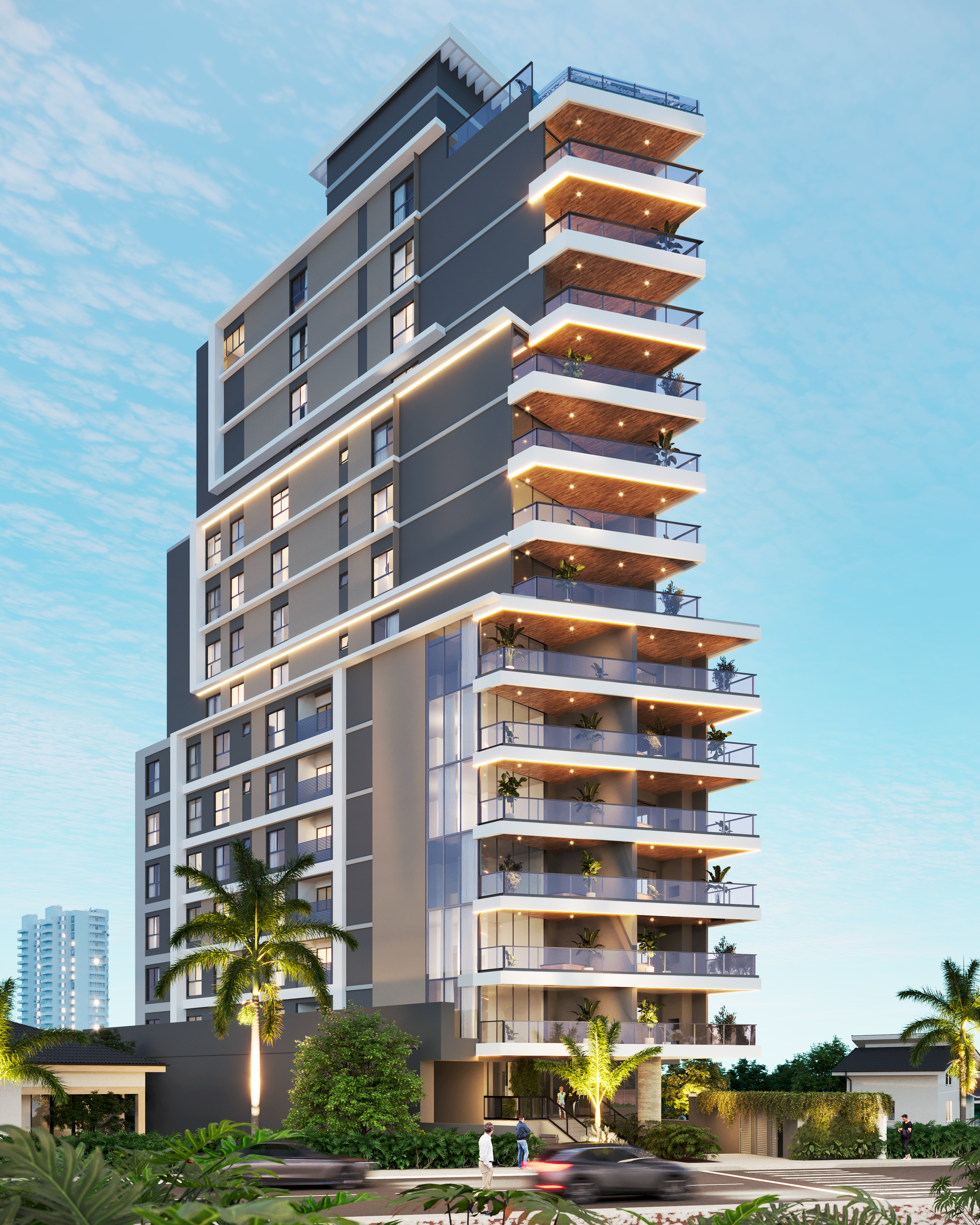 A fachada moderna e imponente destaca-se pela combinação de linhas retas e pela iluminação cênica que valoriza cada detalhe do design, tanto de dia quanto de noite. Cada unidade possui varandas amplas com elementos em vidro e madeira, oferecendo vistas privilegiadas e conexão com o ambiente natural.