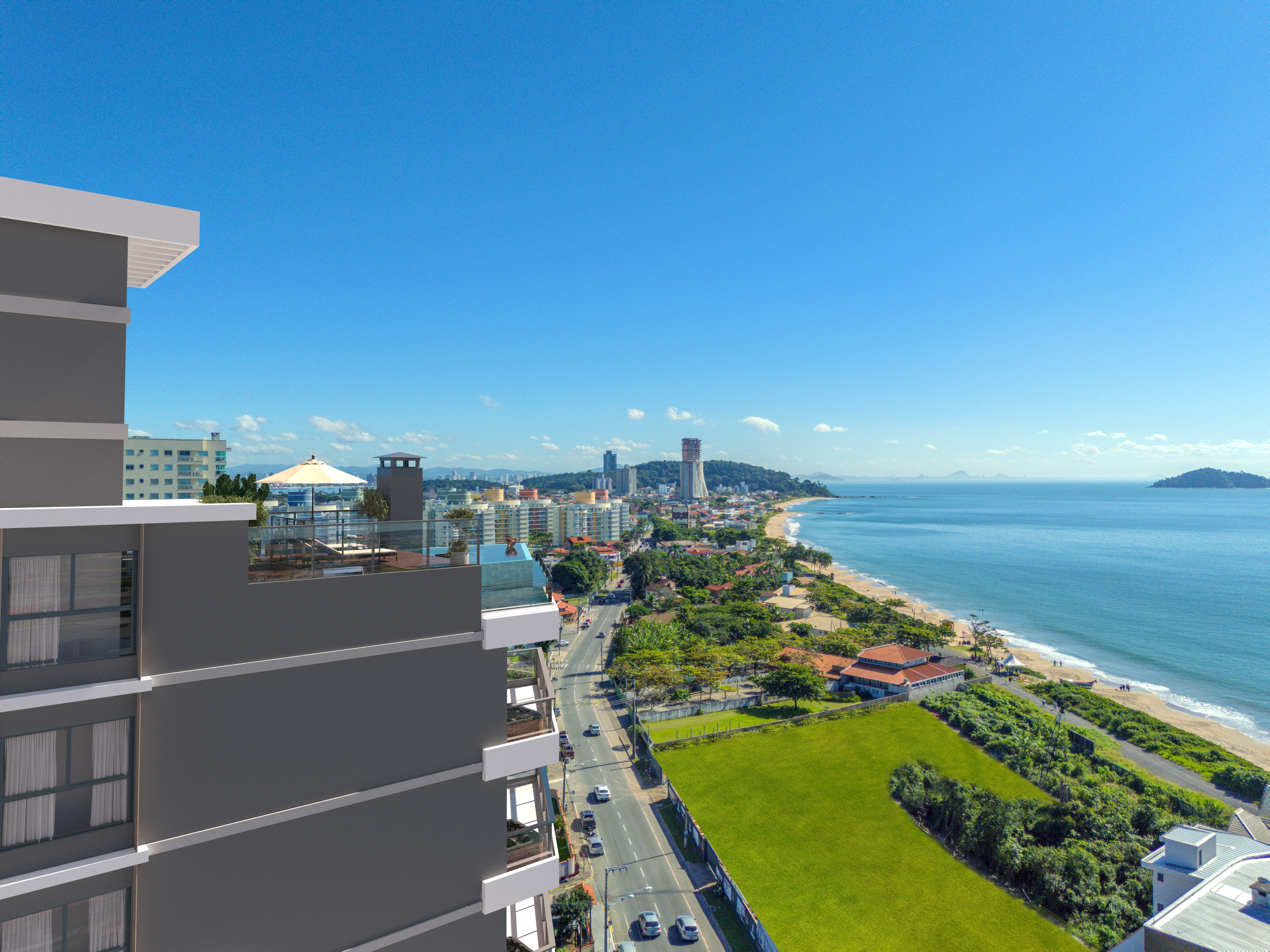 O edifício dispõe de áreas de lazer completas, incluindo academia, salão de festas e espaços para home office, atendendo às necessidades de um estilo de vida prático e moderno. Além disso, na cobertura, os moradores podem desfrutar de uma piscina de borda infinita, com uma vista espetacular para o oceano, criando uma atmosfera exclusiva e relaxante.